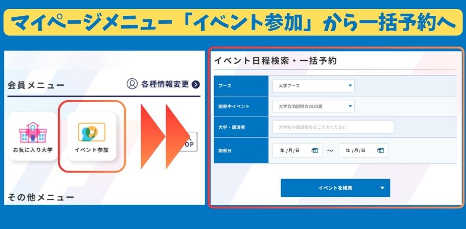 「大学ブース・受験対策ブース・講演ブースから参加したいプログラムを選び、どんどん参加予約をしよう。