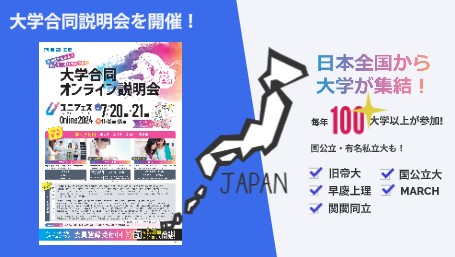 夏と秋の年2回、全国から大学が集まる、大学合同オンライン説明会を開催!イベントでは、100以上の大学の、大学説明会や入試説明会に、サイトやアプリから参加できます。